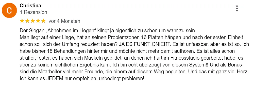 Lerne Abnehmen im Liegen ganz entspannt kennen. Wir garantieren dir bei der ersten Behandlung einen Umfangverlust von 2 – 5 Zentimetern. Bleibt dieser aus, erhältst du dein Geld zurück.